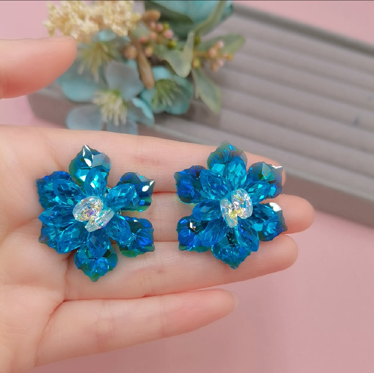 F11 Team Blue Crystal Flower Large Stud Earrings