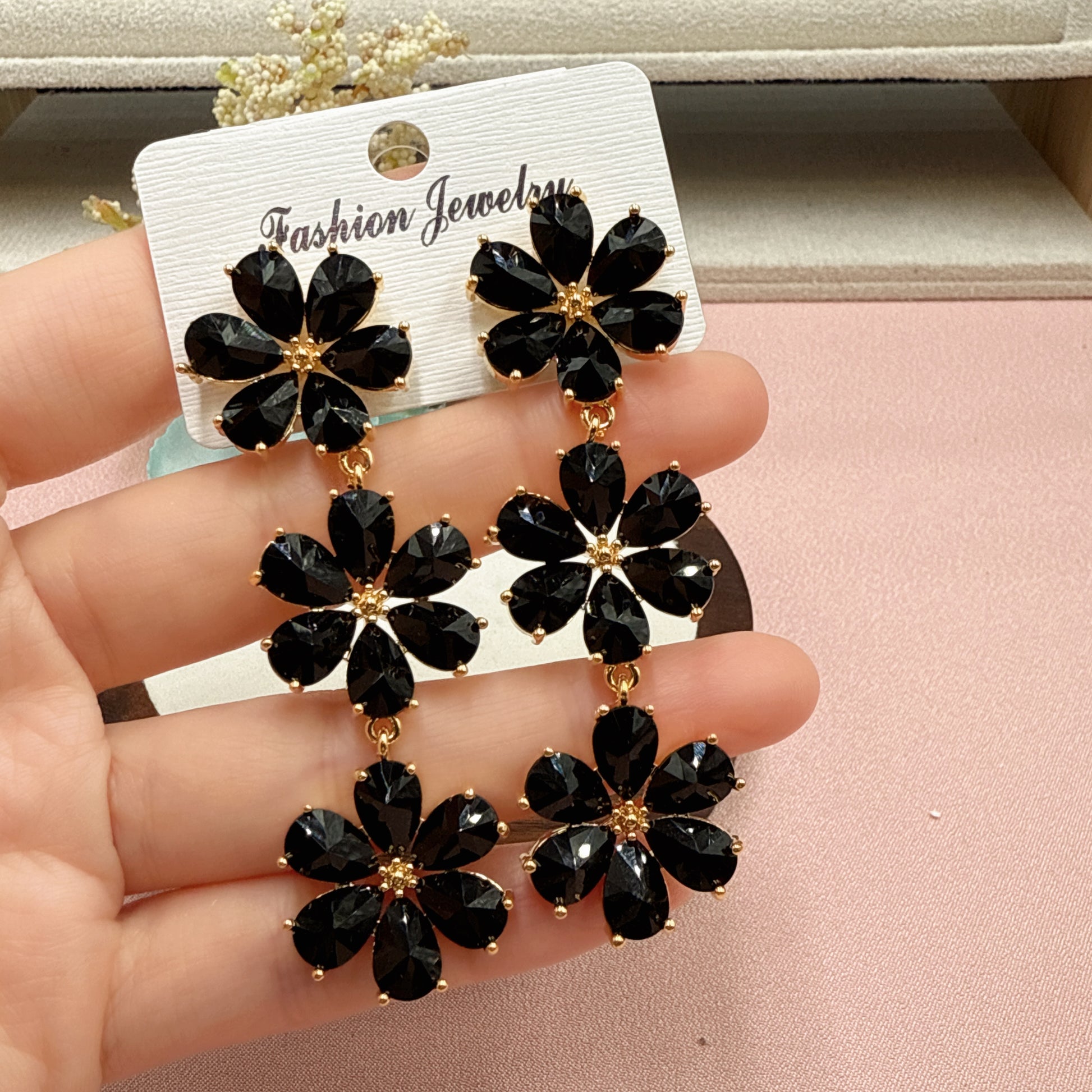 F36 Black Triple Flower Long Drop Earrings
